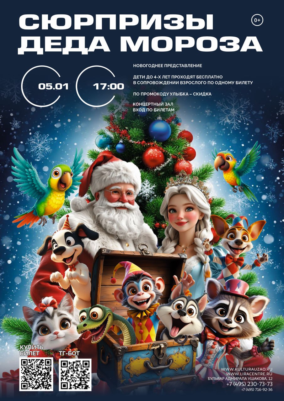 Дорогие родители и дети! Приглашаем вас окунуться в мир настоящего новогоднего чуда, где цирковое искусство встречается с любимой сказкой! В этом году Дедушке Морозу нужна помощь, и он приготовил для юных зрителей особенные "Сюрпризы"!
