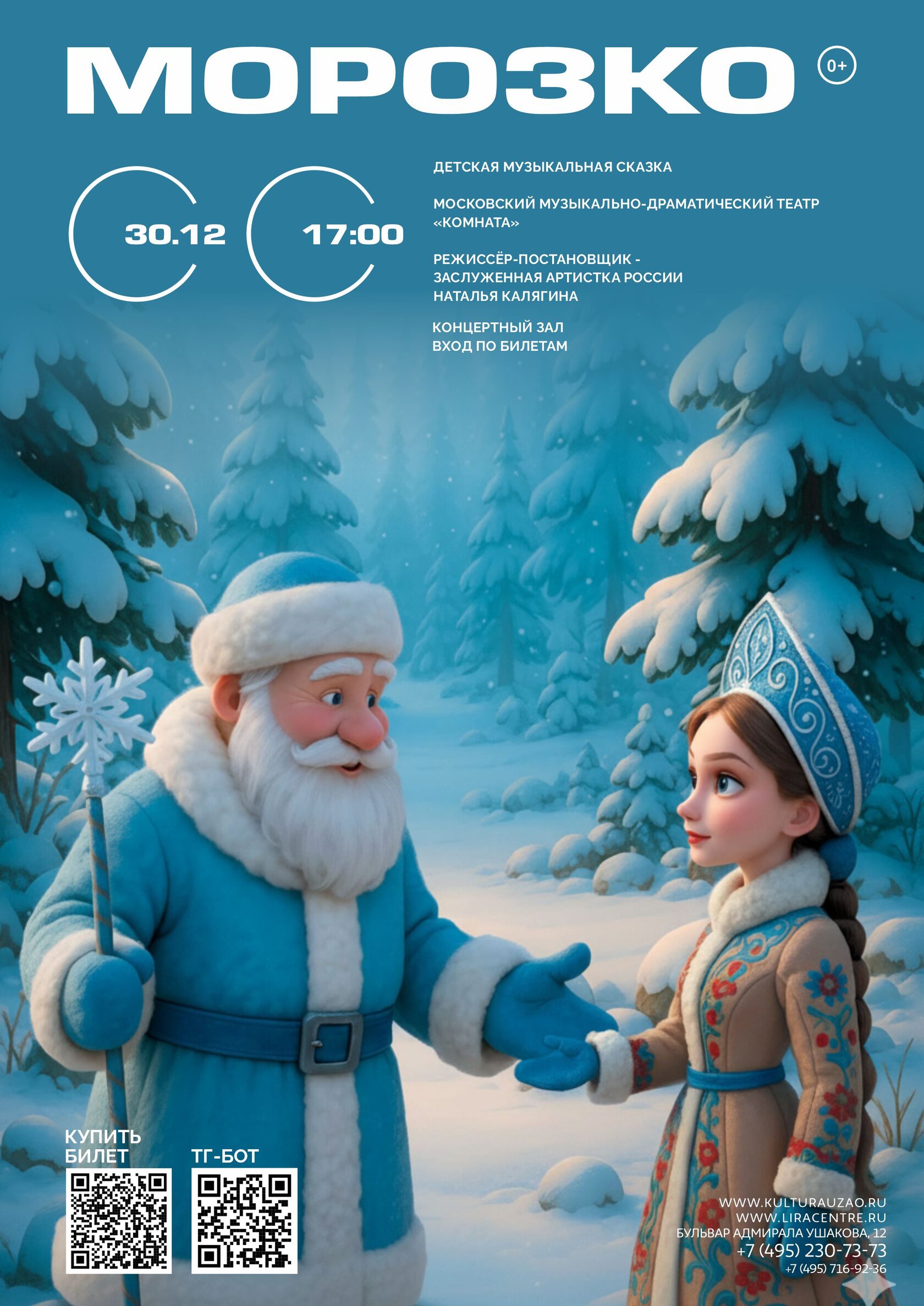 А ещё герои в нашем спектакле поют! Волшебные мелодии – на основе любимой русской музыки советских композиторов – звучат в исполнении артистов ведущих музыкальных театров Москвы.