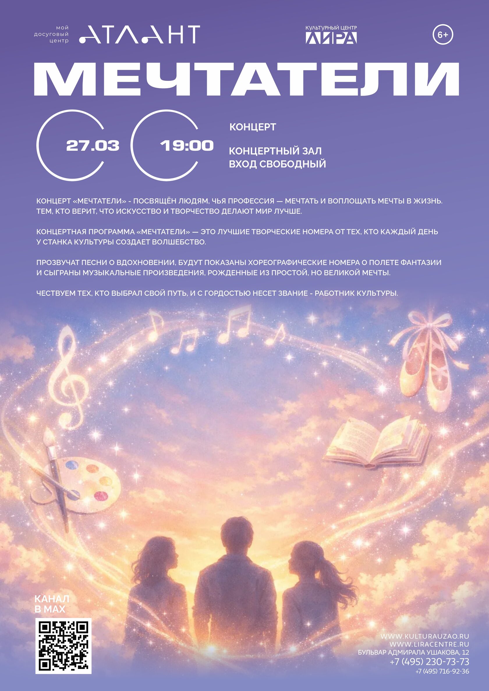 Концерт "Мечтатели" - посвящён людям, чья профессия — мечтать и воплощать мечты в жизнь. Тем, кто верит, что искусство и творчество делают мир лучше.