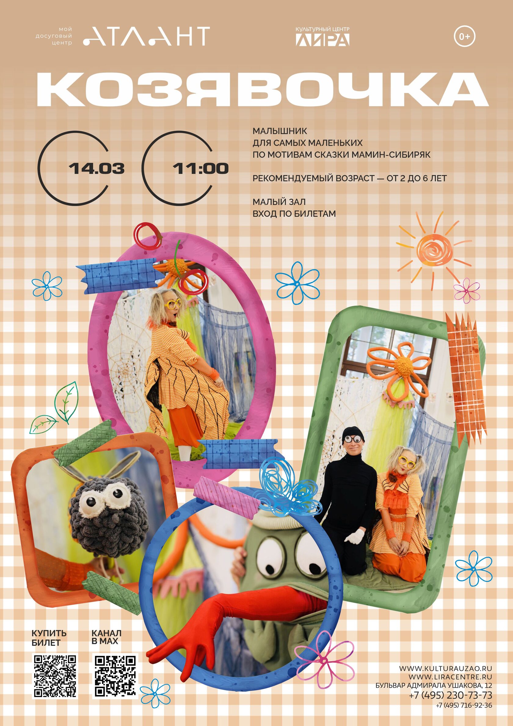 Яркие декорации, большие ромашки, паутина, колокольчик, лягушки, ворона и много всего интересного. Целая козявочкина жизнь – в милой и трепетной истории о микромире!